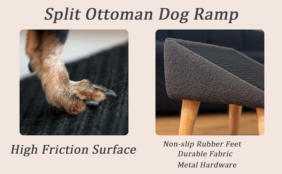 Crafted with care, this 2-in-1 ottoman and ramp features aĀ gently inclined slope (23°) that supports your petās joints while seamlessly serving as a chic footrest for you. No more bulky, unattractive pet gear ā Ottoman RampĀ fits beautifully into any cozy, well-styled home.
